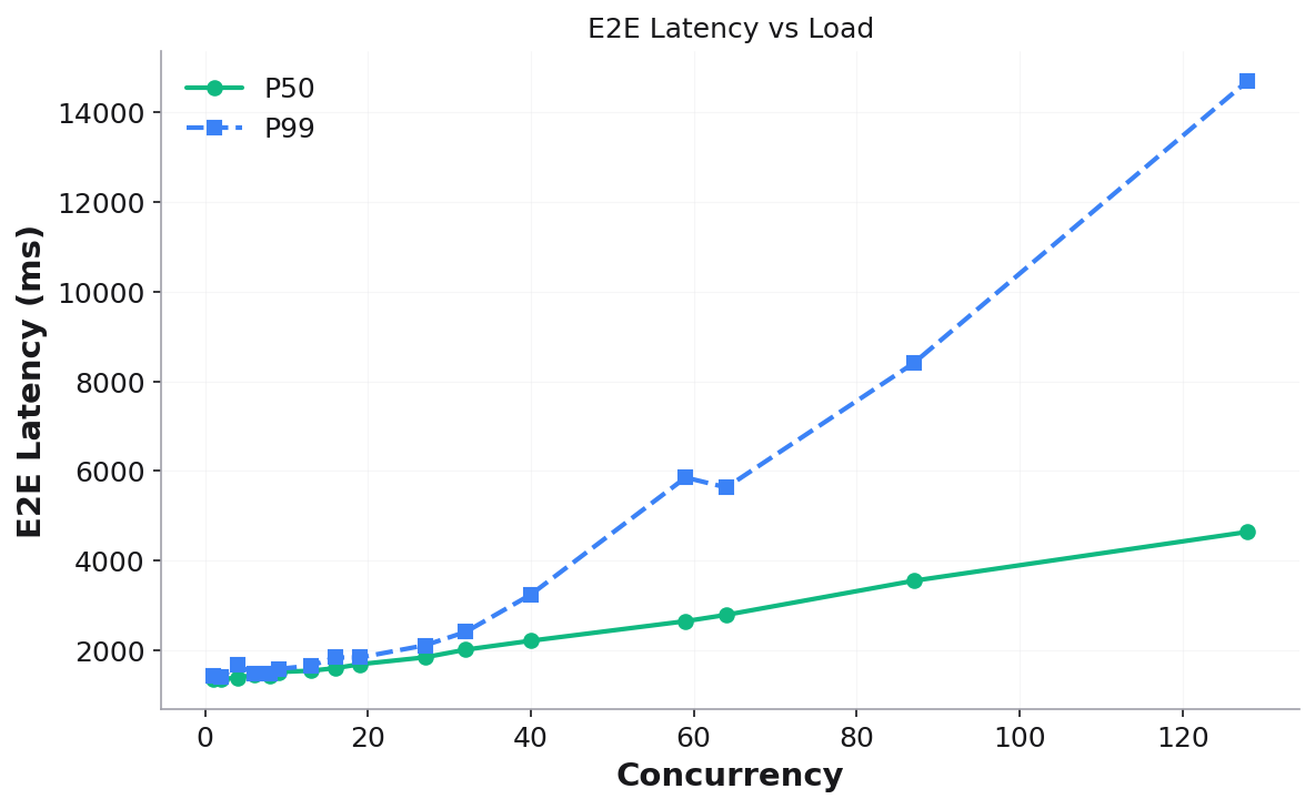 E2E Latency vs Load — P50/P99 latency growth: