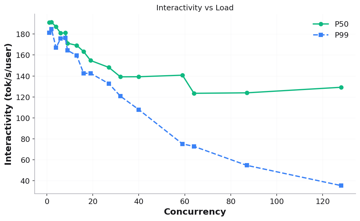 Interactivity P50/P99 — per-user decode speed (1/TPOT, tok/s/user)
