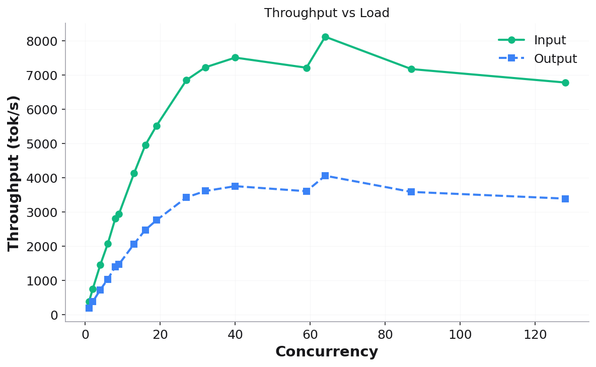 Throughput vs Load — system throughput (input + output) as concurrency increases: